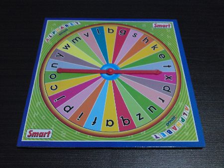 The game set comes with a colourful spinner board, plus 4 reversible game cards… one face featuring all the single letter shapes / alphabets in capital letters and on the flip side showing pictures with word labels emphasizing the beginning letter sounds in words.