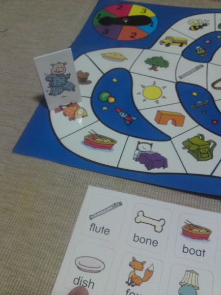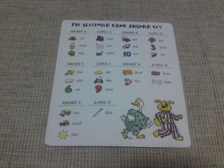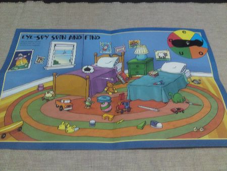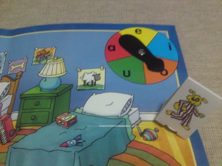 On the reverse side of the game board, the fun continues with another game where the child isn’t even required to read… but instead encouraged to scour the items/objects from the bedroom picture and listen to the sounds in the words corresponding to the picture. The game is called EYE-SPY- SPIN & FIND. The trick is to distinguish the short and long vowel sounds found in the toys and bedroom furniture & appliances according to the vowel sound shown on the spinner and place players’ individual game pieces on the matching one.