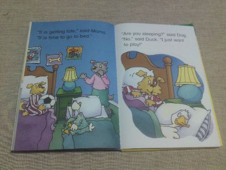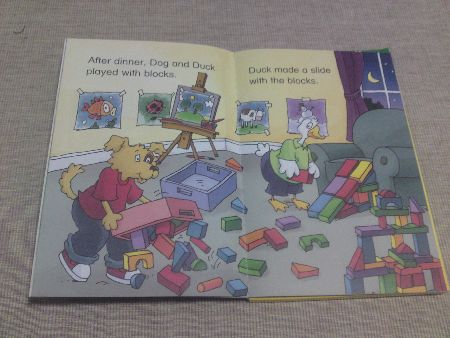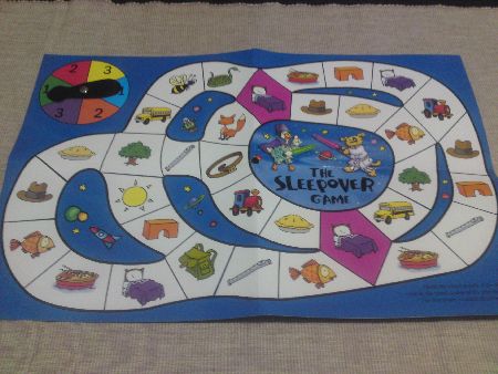 A laminated reversible and colourful game board is nicely folded in a small box behind the book cover. Three game pieces are offered… in stand-up characters duck, dog and pig… in pyjamas as the story tells of a sleppover with friends.
