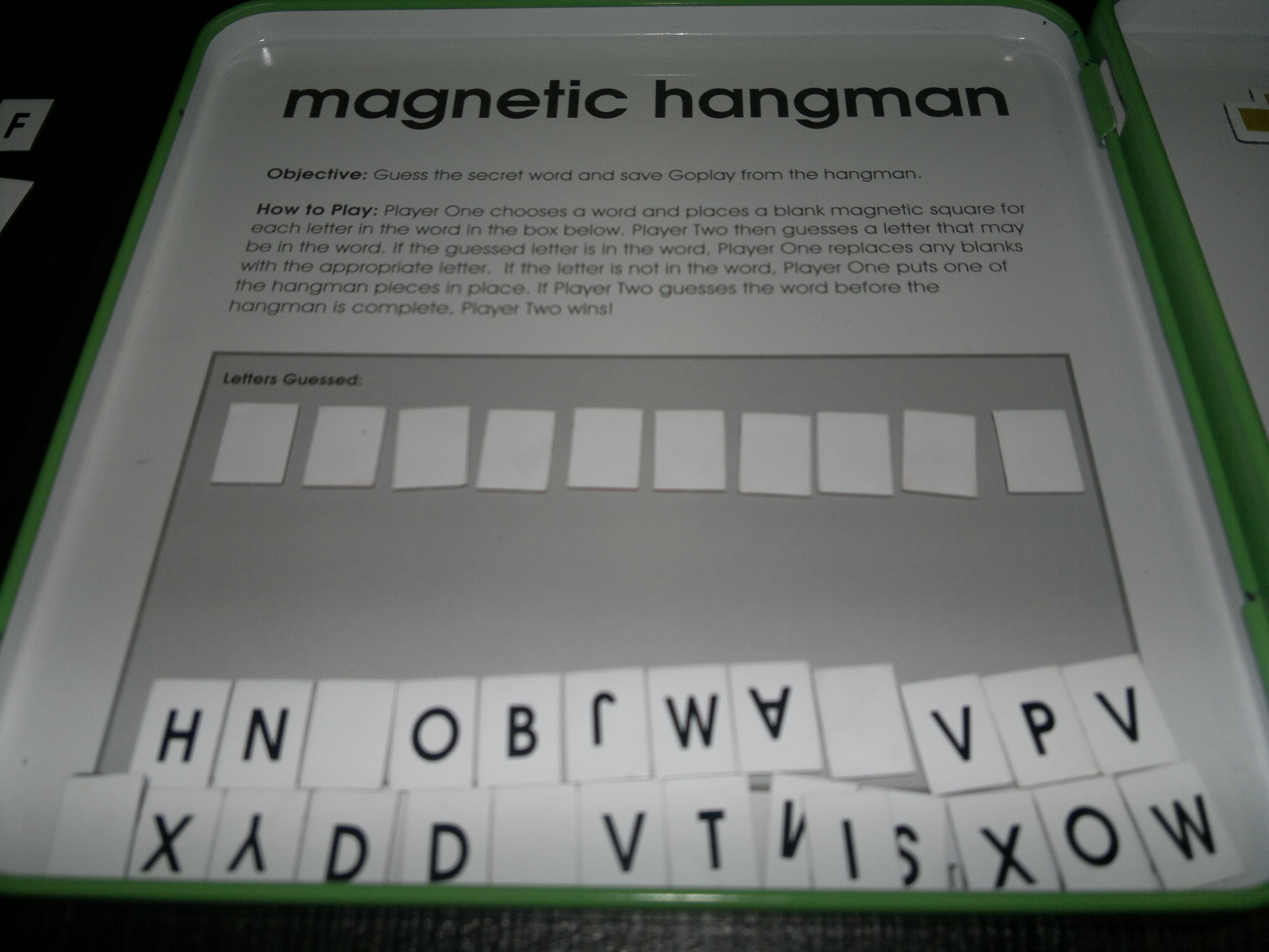 Guide the children till completion (spelling the word correctly) with the magnetic letter pieces or until the man gets hung… the play rules are set by you and your child together.
