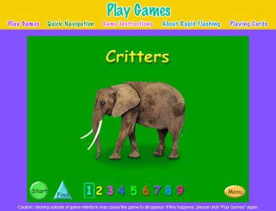 When the Start button is clicked, the sequence is then shown at high speed. You can repeat the sequence when it is finished by clicking on the Start button again. When the child is ready, clicking on the Find button will display a whole gallery of possible items from that particular category.